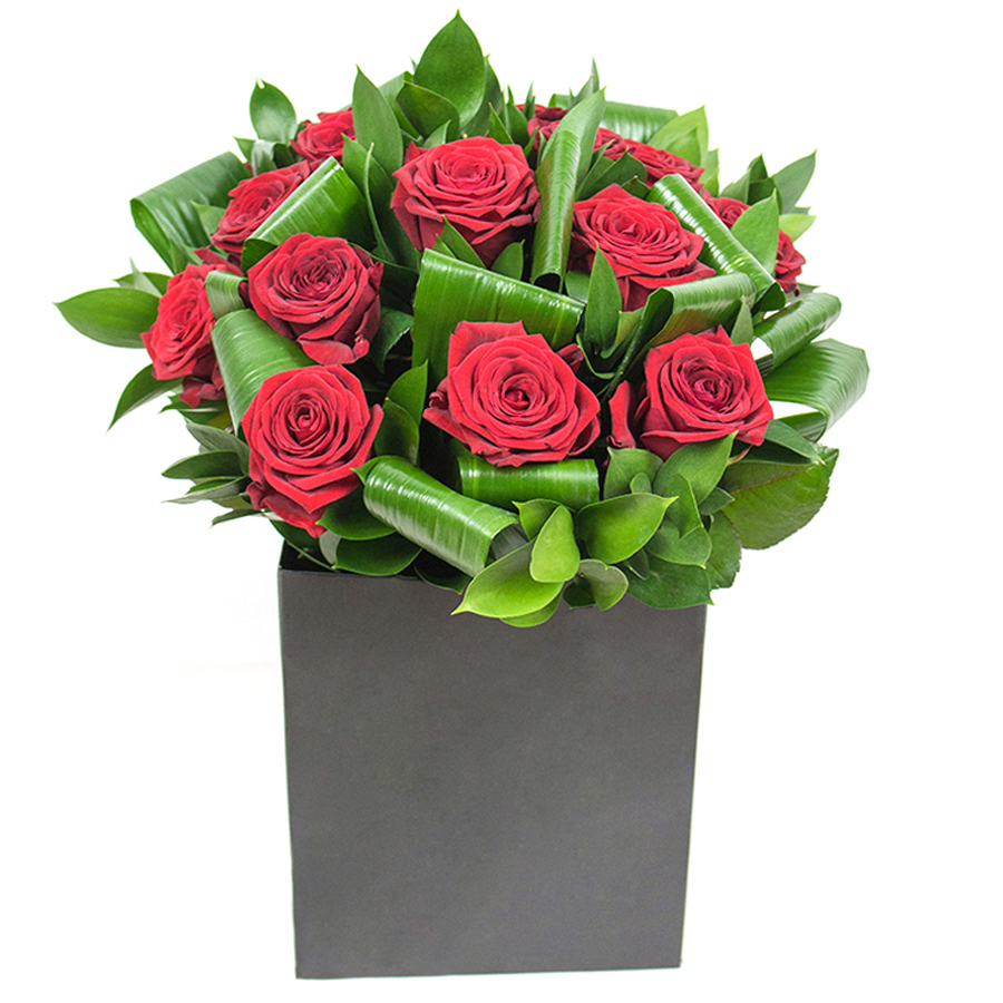 Our radiant bouquet features exquisite red roses, complemented by aspidistra leaves and ruscus, creating a unique and visually stunning floral display.